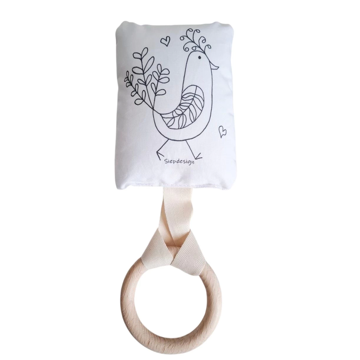 - een beukenhouten bijtring met zacht katoenen knuffeltje met piepgeluid,