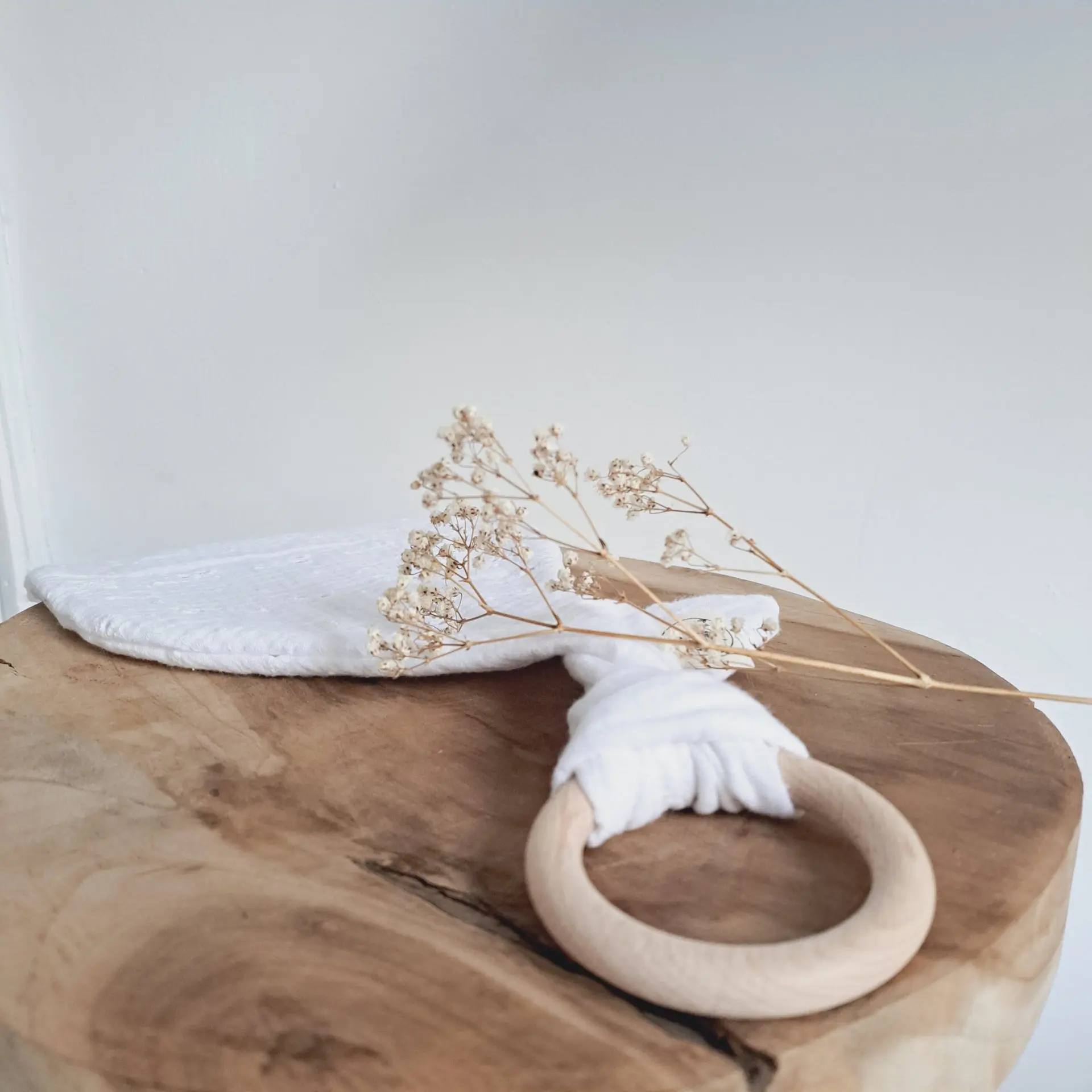 Komen de eerste tandjes er aan? Deze bijtring van beukenhout is fijn om op te sabbelen. Natuurlijk hangt er een troostdoekje aan.
